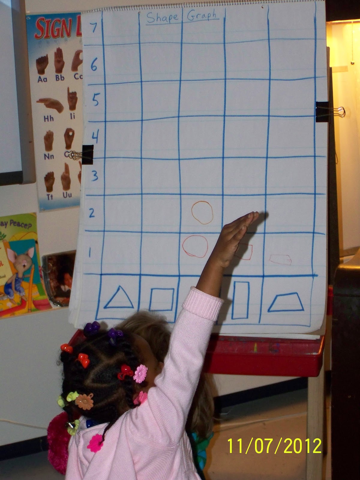 We have taken several pictures of shape creations that the children made from nature. We also took pictures of shapes that the children noticed as we took a "Shape Walk" around the school. As we watched a slide show of these photos recently, we were able to apply our new knowledge of the Spanish names for the shapes. As they named a shape that they saw in each photo in English and Spanish, they also came up to our Shape Graph to draw the shape in the appropriate column. We learned about how graphs give us a lot of information quickly. We realized that graphs allow us to determine quantities without even having to count! (Also known in kindergarten as, "Number Magic")